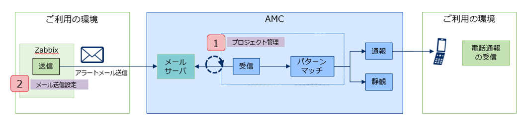 Zabbixで障害検知した際にAMCに通報する設定の流れは次のとおりです。