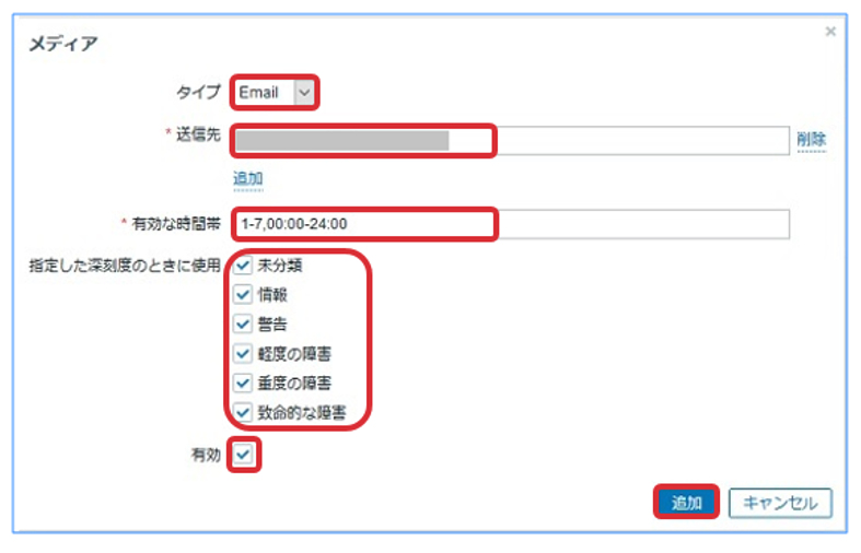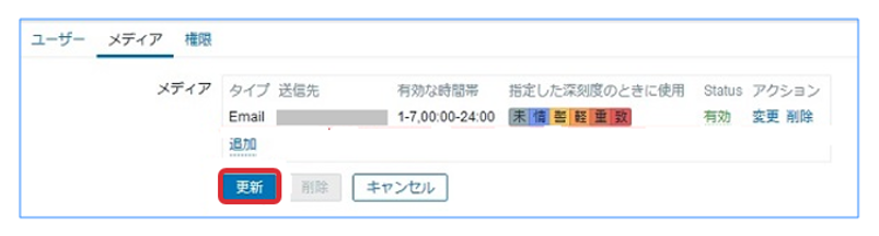 時間帯、深刻度、有効(ステータス)を設定して[追加]ボタンをクリックします。メディアを追加した後、[更新]ボタンをクリックして、登録を完了します。